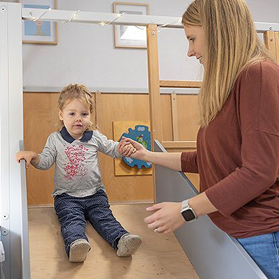 In unserem frisch renovierten U3-Bereich haben wir einen liebevollen Raum für unsere Kleinsten geschaffen, der zum Ankommen, Wohlfühlen, Spielen, Entdecken, Kuscheln und Ruhen einlädt. Denn nur, wenn sich Kinder sicher und geborgen fühlen, entwickeln sie den Mut, ihre Umgebung zu erkunden und Schritt für Schritt die Welt zu erobern. Besonders wichtig ist uns eine individuelle Eingewöhnungszeit, die auf die Bedürfnisse jeder Familie abgestimmt ist. Um den Übergang von der Familie in die Kindertages- einrichtung möglichst sanft zu gestalten, orientieren wir uns am „Berliner Eingewöhnungsmodell“. Dabei wird die Zeit, die das Kind alleine in der Einrichtung verbringt, schrittweise verlängert. Dies geschieht so lange, bis sich das Kind an die neue Umgebung gewöhnt hat und eine vertrauensvolle Bindung zur Erzieherin aufgebaut wurde. Auch wenn unser Gruppenraum viel Geborgenheit bietet, bleiben Mama und Papa die wichtigsten Bezugspersonen. Deshalb ist uns eine enge Zusammenarbeit mit Ihnen als Eltern besonders wichtig, um die Trennungsphase für Ihr Kind so angenehm wie möglich zu gestalten. Gemeinsam entscheiden wir individuell und flexibel, wie viel Zeit Ihr Kind benötigt, um sich sicher von Ihnen zu lösen. Wir behalten die Entwicklungsschritte der Kinder stets im Blick und dokumentieren diese sorgfältig in Portfolioordnern und Beobachtungsmappen. Zusätzlich fördern wir den täglichen Austausch während der Bring- und Abholzeit, insbesondere in unserer Gruppe „Mauseloch“. Unser großzügiger Gruppenraum bietet viel Platz zum Spielen, Verstecken und Bewegen, sodass die Kinder ihrem natürlichen Bewegungsdrang freien Lauf lassen können.